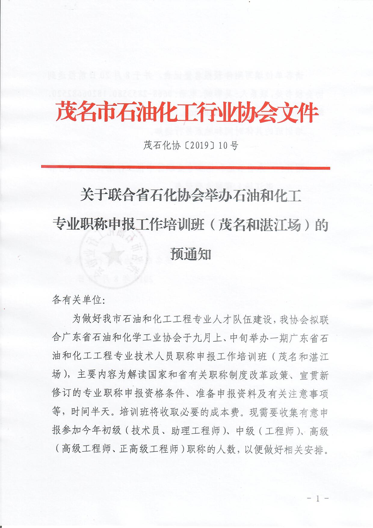 【茂石化協〔2025〕3號】關于舉辦2024年度市化工輕工環保中(初)級專業職稱評定申報培訓班的通知